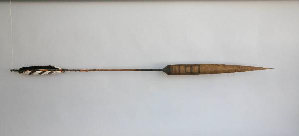 Freccia con punta e asta in canna. La penna è di colore bianco con striature scure. L'estremità dell'asta più vicina alla penna è decorata con motivi pirografati. La decorazione è composta da cinque fasce. La punta é tinta di nero con il curaro sul retro, mentre il davanti presenta il veleno con un motivo a spina di pesce.