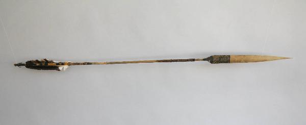 Freccia da bambino con punta e asta in canna. La penna è di colore nero con il fondo bianco. L'estremità dell'asta più vicina alla penna è decorata con motivi pirografati.La decorazione è composta da sei fasce, divise in due gruppi da tre. La punta é tinta di nero con il curaro sul retro, mentre il davanti presenta il veleno con un motivo a spina di pesce.