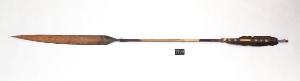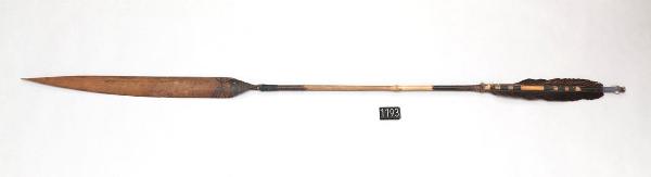 Freccia da bambino con punta e asta in canna. La penna è di colore marrone. L'estremità dell'asta più vicina alla penna è decorata con motivi pirografati. La decorazione è composta da otto fasce, due più larghe agli estremi e in mezzo sei più sottili divise in due gruppi da tre. La punta è tinta di nero con il curaro.