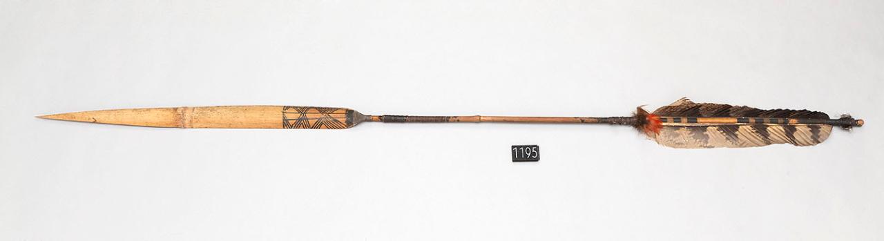 Freccia da bambino con punta e asta in bambù. La penna è di colore marrone chiaro con striature scure. L'estremità dell'asta più vicina alla penna è decorata con motivi pirografati. La decorazione è composta da otto fasce , due più larghe agli estremi e in mezzo sei più sottili divise in due gruppi da tre. La punta é colorata di nero con il curaro sul retro, mentre la parte anteriore è decorata con il veleno con un motivo a spina di pesce.