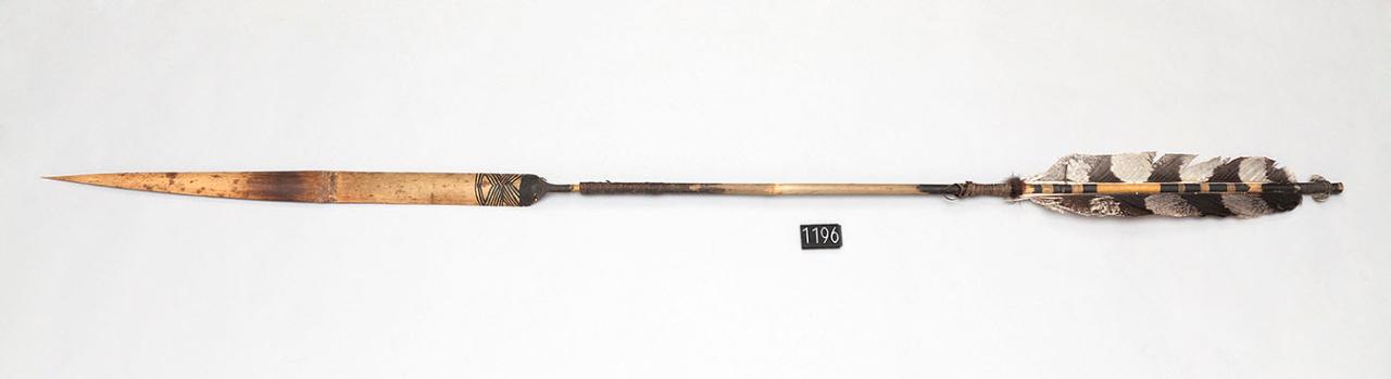 Freccia da bambino con punta e asta in canna. La penna è di colore bianco con striature scure. L'estremità dell'asta più vicina alla penna è decorata con motivi pirografati. La decorazione è composta da otto fasce, divise tre e cinque. La punta é tinta di nero con il curaro sul retro, mentre il davanti presenta il veleno con un motivo a spina di pesce.