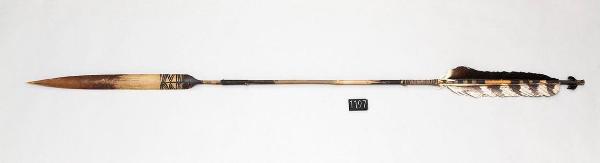 Freccia da bambino con punta e asta in bambù. La penna è di colore bianco con striature scure. L'estremità dell'asta più vicina alla penna è decorata con motivi pirografati. La decorazione è composta da sei fasce , divise tre e tre. La punta é tinta di nero con il curaro sul retro, mentre il davanti presenta il veleno con un motivo a x.
