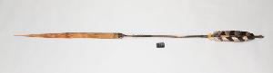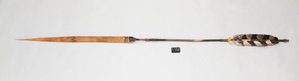 Freccia da bambino con punta e asta in canna. La penna è di colore bianco con striature scure. L'estremità dell'asta più vicina alla penna è decorata con motivi pirografati. La decorazione è composta da sei fasce , divise tre e tre. La punta é tinta di nero con il curaro sul retro, mentre il davanti presenta il veleno con un motivo a spina di pesce.