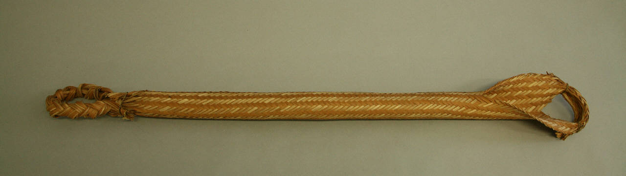 Spremitoio di manioca in fibra intrecciata per spremere. La fibra è intrecciata a cilindro e presenta una estremita ad anello chiuso e l'altra aperto per permetterne l'inserimento della manioca grattuggiata.