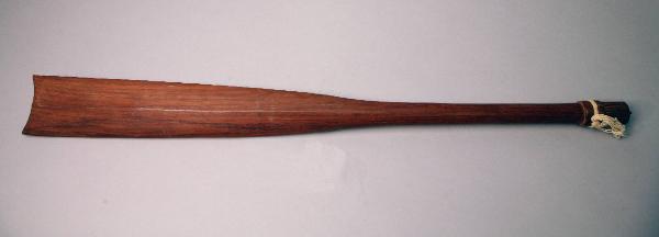 Mazza in legno con manico e parte terminale larga e piatta. all'impignatura sono legati fili di cotone bianco.