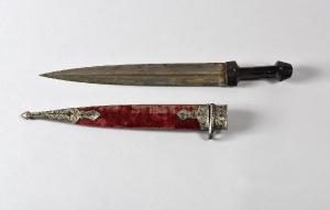 Impugnatura di corno, in due guancette attaccate al codolo, di sezione esagonale allargata all'attacco della lama e formante all'altra estremità una sorta di pomo piatto ogivale. Sul pomo e all'attacco della lama, due piastrine d'argento sagomate, decorate a cesello e a niello; la piastrina superiore è bombata e quella inferiore piatta. Lama larga, dritta a due fili convergenti in curva e a sezione di losanga, di damasco saldato a strati, con disegno evidente lungo lo sguscio laterale. Fodero in legno ricoperto di velluto, con montature in argento all'imboccatura, con sotto una fascetta con anello per la sospensione, bloccata da un'altra fascia sagomata frontalmente; puntale conico con finale a bulbo. Sul retro l'argento è semplice e si notano tre punzonature (poco leggibili), il velluto è consumato e mostra i segni delle cuciture. Frontalmente le stesse montature sono decorate a cesello e a niello a tralci floreali.
