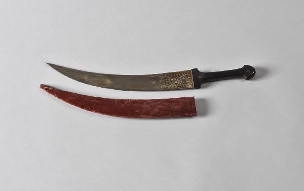 Impugnatura di sezione ovaleggiante, costituita da due guancette di legno nero attaccate al codolo da due rivetti metallici, che si allarga all'attacco della lama e forma all'altra estremità una sorta di pomo piatto ogivale. Lama curva a due falsi fili convergenti a punta acuta. Decorazione floreale stilizzata a koftgari in argento (con danni) su entrambi i lati. Fodero in legno ricoperto da velluto rosso, di sezione ovale schiacciata, che segue il profilo della lama.