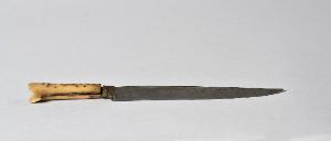 Impugnatura in osso di sezione circolare con espansione al fondo, formata da due guancette saldate al codolo da tre rivetti metallici. La guancetta frontale è intarsiata con piccole pietre rosse a puntini, mentre l'altra è priva di decorazione. Una fascetta d'ottone congiunge la lama con l'impugnatura. Lama semplice, dritta, a un taglio e punta acuta. Su un piano, all'altezza del forte, incisioni a C, e dal medio al debole due sgusci paralleli in prossimità del dorso; sull'altro piano una fine scanalatura lungo il dorso.