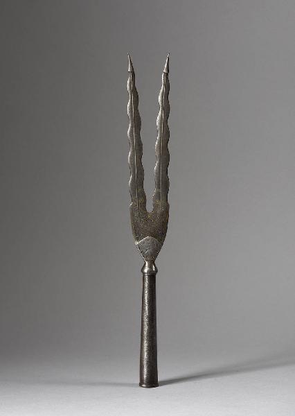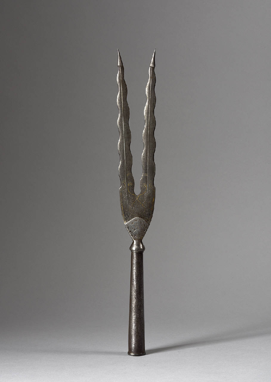 Gorbia troncoconica, anellata alla base e terminante in un nodo dal quale si espande il ferro, di sezione piatta al forte e leggermente più spesso in basso. Questa zona è decorata interamente su entrambi i piani a motivi vegetali a bassorilievo, e con agemina d'oro su un solo piano. Il ferro si divide in due rebbi ad andamento sinuoso, nervati per tutta la loro lunghezza, terminanti a punta acuta.