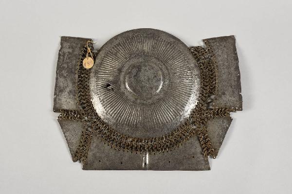 Petto di corazza costituito da specchio centrale con fitte scanalature radiali e umboncino centrale, legato mediante maglia con cinque piastre. Marchio: tripla asta con mezzaluna.