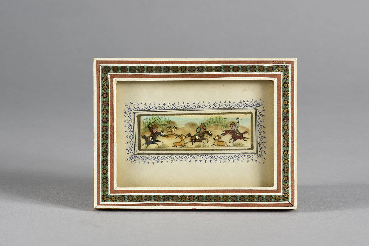Quadretto in legno con intarsi contenente una raffigurazione di scena di caccia dipinta su osso.