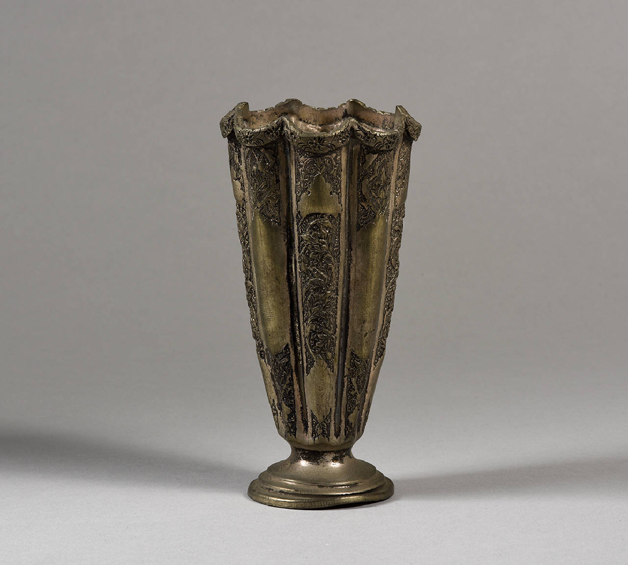 Vaso a cono polilobato in metallo argentato