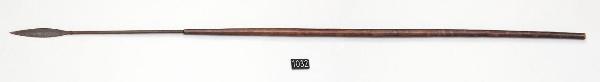 Lancia. Punta a foglia e lungo codolo decorato. Asta in legno scuro.