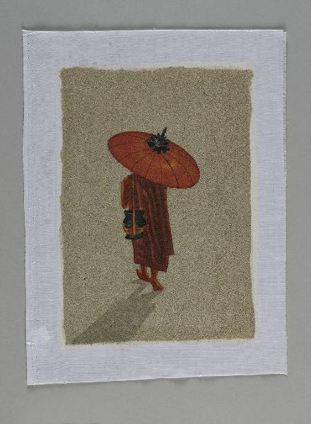 Dipinto su sabbia raffigurante un monaco sotto un parasole che incede trasportando una cesta. La figura è vista da dietro e proietta sul terreno la sua ombra.