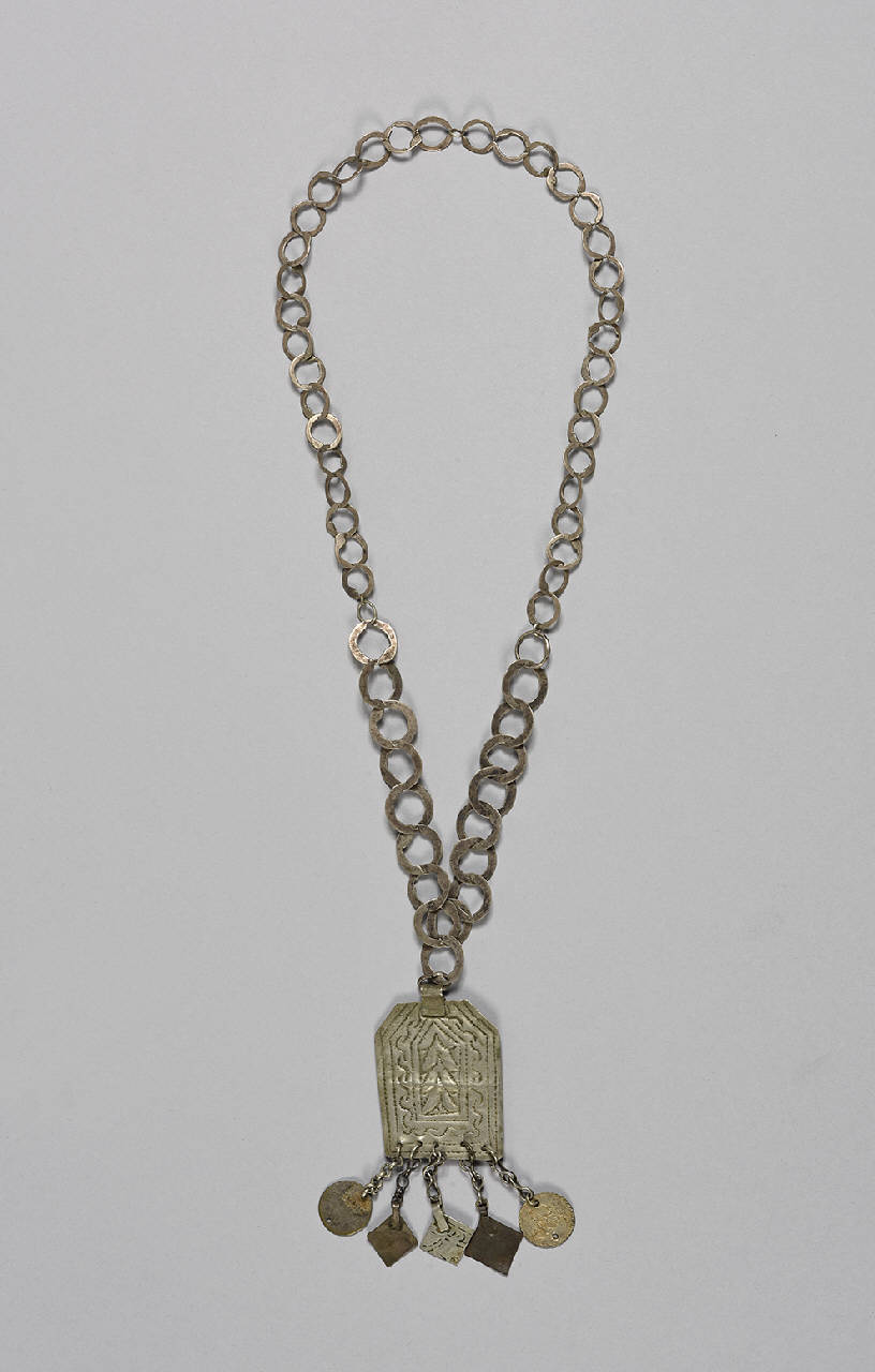 Catena ornamentale a maglie circolari appiattite con medaglione pentagonale al quale sono appesi 5 pendenti (3 quadrati, 2 rotondi). Sui pendenti compaiono caratteri arabi