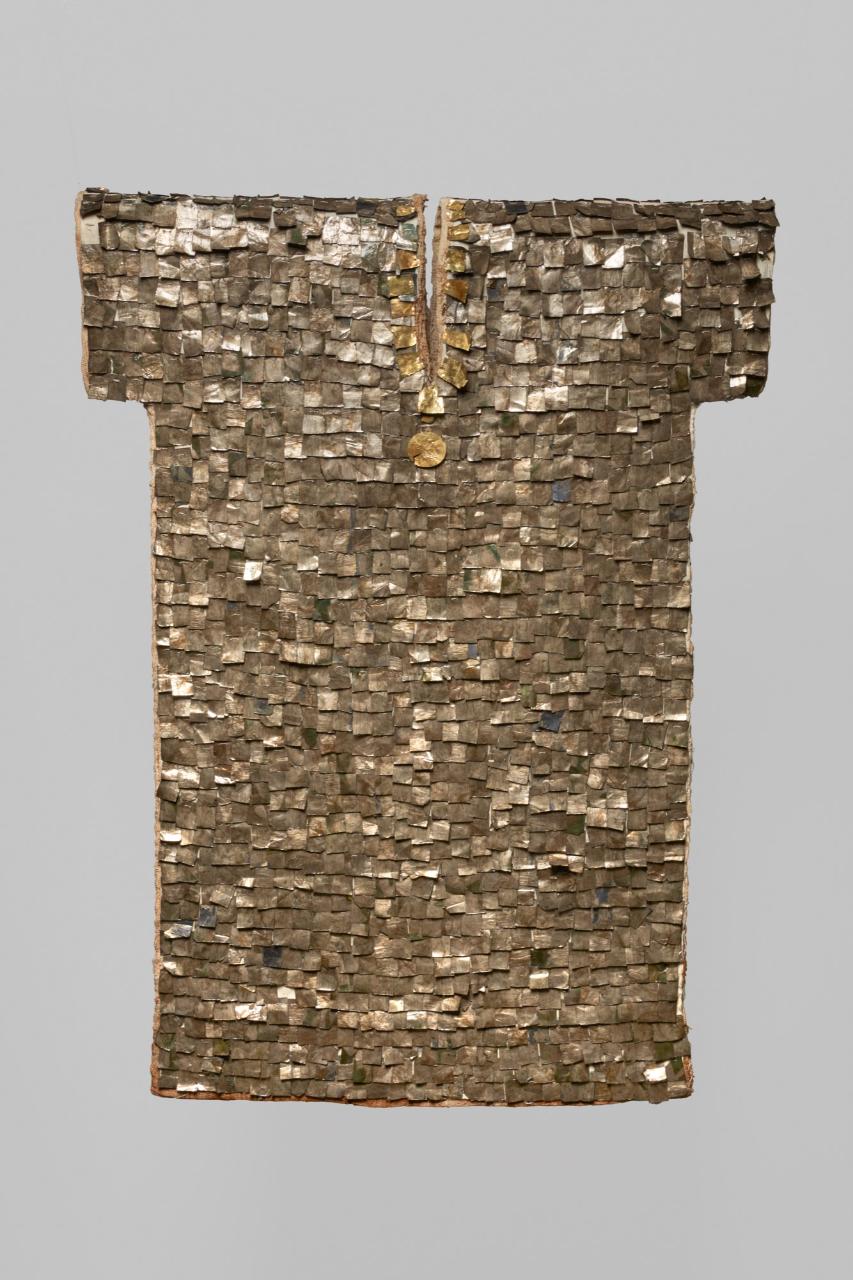 Tessere in metallo cucite su una tela antica ricomposta da almeno due pezzi non coerenti cuciti tra di loro a formare una veste fronte-retro. Sullo scollo sono presenta 16 tessere rettangolari e una tonda dorate come decorazione.