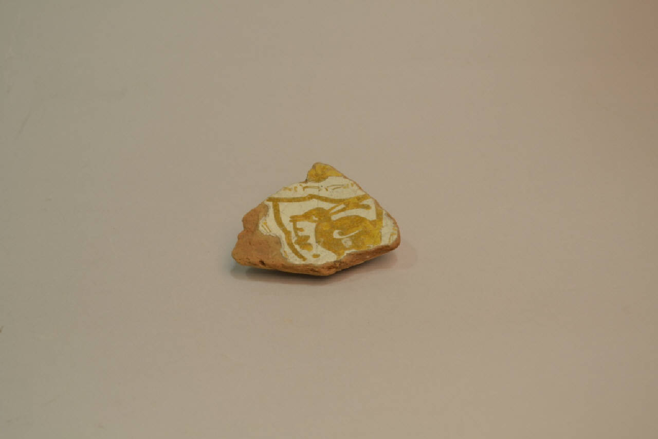 frammento di recipiente (fondo) in ceramica a lustro metallico. Le decorazione è costituita da motivi zoofitomorfi dipinti in color ocra chiara su fondo bianco.