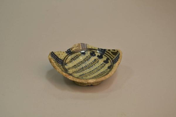 Frammento di recipiente (fondo) in ceramica dipinta in nero e blu su fondo bianco con vetrina trasparente. La decorazione è costituita da motivi geofitomorfi . L'impasto è bianco
