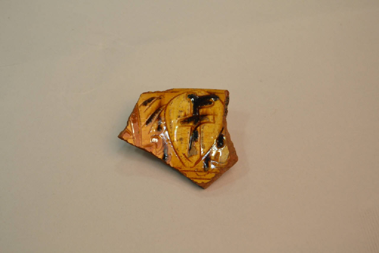 Frammento (parete) di recipiente in ceramica graffita e invetriata. All'interno di uno scudo con sfondo chiaro compare una spada? . La vetrina dell'intero manufatto è di color giallo , mentre lo spesso impasto ceramico è di color rosso acceso.