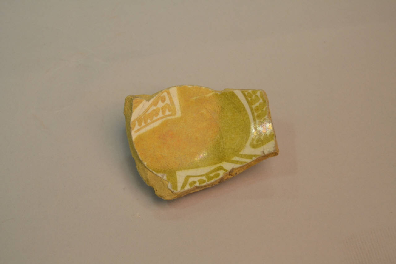 frammento di recipiente (fondo) in ceramica a lustro metallico. Le decorazione è costituita da motivi zoomorfi dipinti in color ocra chiara su fondo bianco