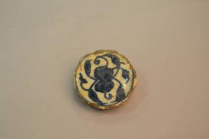 Frammento di recipiente (fondo) in ceramica dipinta in nero e blu su fondo bianco con vetrina trasparente. La decorazione è costituita da motivi geofitomorfi . L'impasto è bianco