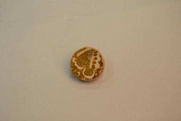 frammento di recipiente (fondo) in ceramica a lustro metallico. Le decorazione è costituita da motivi zoomorfi dipinti in color ocra chiara su fondo bianco