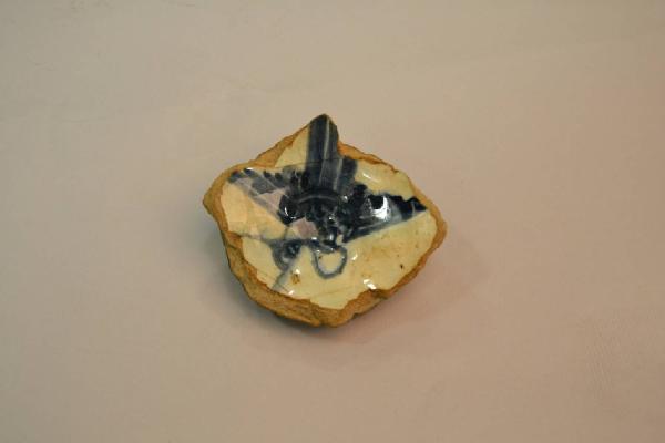 Frammento di recipiente (fondo) in ceramica dipinta in nero e blu su fondo bianco con vetrina trasparente. La decorazione è costituita da motivi geofitomorfi . L'impasto è bianco