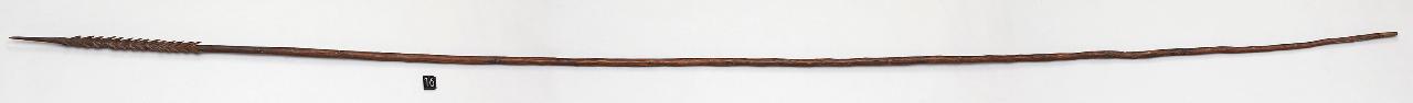 • NOTIZIE STORICO CRITICHE Gli aborigeni australiani svilupparono diversi tipi di lance a seconda dell'uso alle quali erano destinate, che erano principalmente caccia e pesca, ma talvolta anche il combattimento. Solitamente le lance erano utilizzate per cacciare animali veloci, mentre quelli più lenti erano finiti con i bastoni. Le lance sono fatte di diversi tipi di legno, come l'acacia, piante leguminose, spinifex, cordyline australis e jarrah (un tipo di eucalipto) e avevano punte irrigidite al fuoco o di osso, conchiglia, pietra e raramente metallo. Queste lance, ottenute da un pezzo solo di legno, estremamente lunghe e con elaborati intagli a spuntoni non permettevano un uso pratico, ma erano utilizzate per scopi rituali. Stone mostra dei modelli simili, ma delle isole Figi. Simile a 259.Due arpioni di legno sono segnalati nella donazione Bergomi Subert 1940, ma è possibile che questa indicazione sia errata. Potrebbero appartenere alla scomparsa donazione di Cesare Bossi che aveva donato 36 pezzi australiani, fra i quali anche alcune lance.\nRiferimenti:\nAA.VV., Museo dell'uomo, usi, costumi, tradizioni di tutti i popoli della Terra, [W.E.L. Italiana] Milano, Fratelli Fabbri Editori, 1964, Vol. 7.\nSTONE, George Cameron, A glossary of the construction, decoration and use of arms and armours; in all countries and in all times, New York, Jack Brussell Publisher, Noble offset printers inc., 1961.\nHogarth Arts Australia, www.hogarthartsaustralia.8k.comAborigines Tools and Weapons, www.att.virtualclassroom.org/vc97/VC_07/A_TRART.HTMPrimitive Technology Artifact Sales, www.flight-toys.com/artifacts.htm