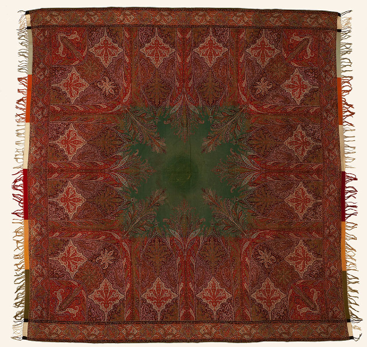 Scialle quadrato con riserva verde, bordure arlecchino sui lati dell'ordito a riprendere i colori delle trame lanciate. Il manufatto è foderato da un tessuto barrato avorio provvisto di cimose e cucito seguendo l'ordito dello scialle medesimo. I 4 angolari di forma quadrata (cm. 46 x 51 circa) del disegno sono raccordati tra loro su tutti i lati dello scialle attraverso due strutture "architettoniche" a nicchia con arco ogivale. Angolari e nicchie sono divisi in compartimenti romboidali dal profilo festonato che ricorda i lobi di archi islamici cuspidati; al loro interno si alternano motivi a palmetta, infiorescenze stilizzate (fiori di loto?) e boteh. La silhouette degli angolari e delle struttura "architettoniche" è ammorbidita da una sequela di foglie lanceolate; dai vertici interni degli angolari e dallo spazio tra le arcate ogivali partono 8 aeree palmette convergenti al centro. Le bordure si caratterizzano per una serie di incorniciature ogivali a doppia punta allacciate a un tralcio continuo di boteh a "nastro".