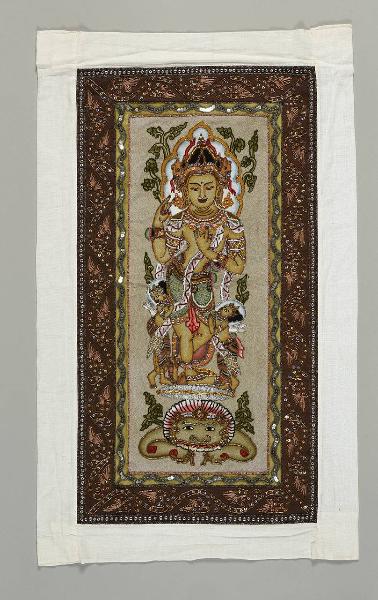 Dipinto tradizionale da parete eseguito su sabbia con un supporto di tessuto ricamato, ornato di psillettes, perline e fili metallici (?). Raffiugura ARY MAYDEYA (MAITREIA), il Budda del futuro.
