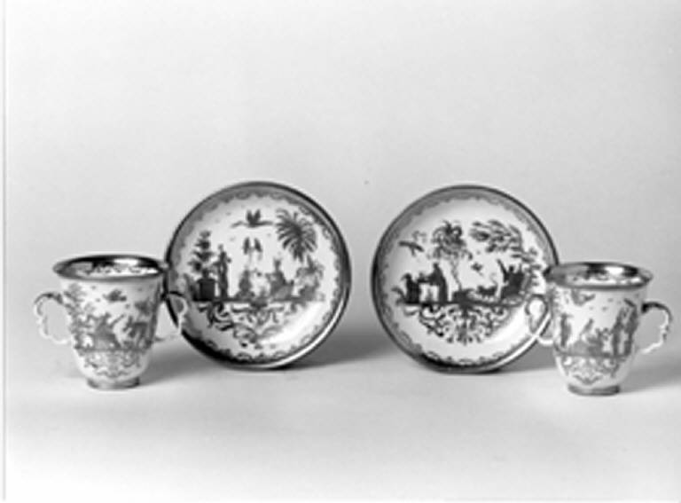 Tazza su piede dorato ad anello con due manici ad ansa modellati e parzialmente dorati, profilo esterno della bocca dorato con puntinatura, interno a fascia dorata più alta con decoro "a merletto". Il decoro dipinto in oro su fondo bianco è a cineserie su basi "Laub und Bandelwerk".
