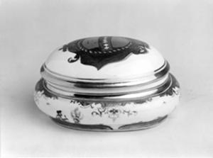 Bomboniera ovoidale con coperchio bombato; il corpo e il coperchio recano un doppio profilo in oro. Il corpo presenta un decoro dipinto a cineserie, con ornato superiore a girali e fiori in oro e lilla e riserva a graticcio, pure in oro.\nSul coperchio è dipinto uno stemma su fondo oro con decoro a ovuli rosso-arancione che incornicia l'ovale centrale a fascia orizzontale azzurra e segmenti bianchi a doppia terminazione lobata; girali piumati a volute e drappi a festoni circondano l'ovale centrale.