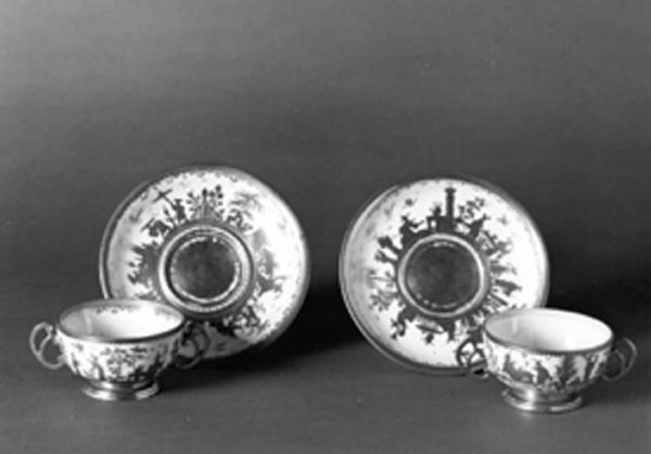 Tazza da tè con due manici biansati e dorati, su alto piede modanato e dorato con profilo a scagliette. Il bordo esterno e quello interno sono profilati in oro, rispettivamente con decoro a festone e a merletto.\nLa superficie esterna delle tazze presenta un decoro a cineserie dorate.