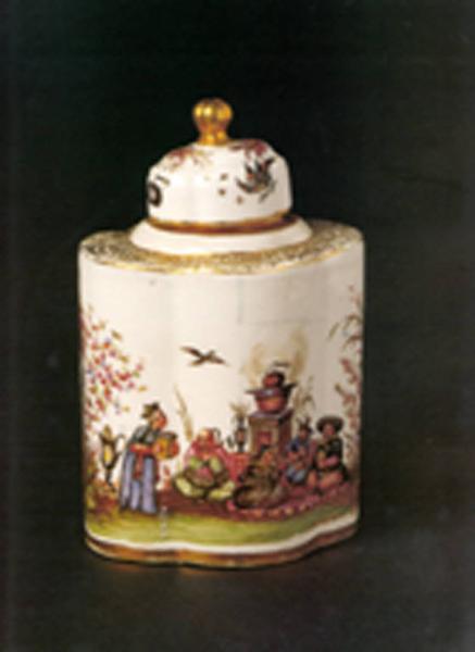 Scatola porta tè quadrilobata con piccolo coperchio, pure quadrilobato, sormontato da presa dorata a pomolo. Il corpo è dipinto con cineserie.\nLa ricca policromia comprende il verde brillante,l'azzurro, il cremisi, il grigio chiaro e scuro, il rosso-ferro. \nLa scatola reca un profilo dorato alla base, nel punto di contatto con il coperchio, e decoro dorato "Laub und Bandelwerk" sulla spalla.
