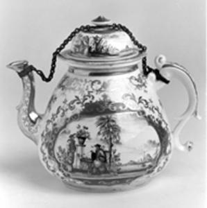 Teiera bombata con coperchietto a cupolina, sul quale è praticato un piccolo foro, e pomolo a forma di pagoda. Sul corpo la presa a orecchia termina con volute lumeggiate d'oro ed è ornata con fiori dipinti sul dorso; il beccuccio è dipinto in oro con decori geometrici in rosso-ferro e lilla. Il basso piede ad anello, il collo e il coperchio sono filettati d'oro. Il coperchietto è fissato alla presa per mezzo di una catenella metallica stretta intorno alla base del pomolo.\nIl corpo, di forma barocca , è riccamente decorato con profili dorati "Laub und Bandelwerk" ed è quasi interamente occupato da due grandi cartelle, pure circondate da decori a volute in oro, dipinte in rosso ferro e viola; il " Bottger-luster" è steso nella zona dipinta fra le volute e la filettatura delle cartelle. Nelle cartelle sono rappresentate cineserie. Scenette in tutto simili sono dipinte lungo la circonferenza del coperchio.
