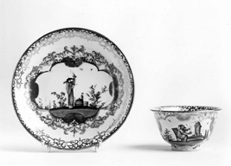 Tazza da tè senza manici, su piede ad anello, con cartelle filettate in oro che racchiudono cineserie e sono circondate da un decoro policromo a volute piumate in rosso-ferro e rosa tenue.\nIl bordo interno reca una fascia "Laub und Baldelwerk" in oro.