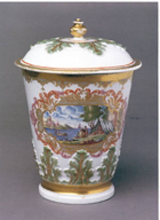 - NOTIZIE STORICO CRITICHE Il decoro è tipico dell'esecuzione "Haumalerei", come indica lo stile dei paesaggi dipinti nelle cartelle e, in particolar modo, l'accesa policromia.\nNon si può escludere che l'oggetto sia stato prodotto a Meissen intorno al 1720 e , successivamente, decorato ad Augsburg. Il rilievo a foglia di acanto è desunto dalla lavorazione dell'argento, mutuato dal grès rosso di Bottger.\nProbabilmente il decoro dipinto risale alla fine del XIX sec.