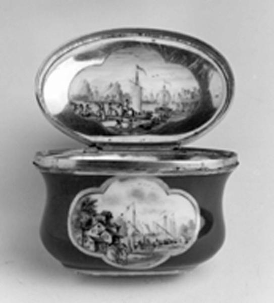 Tabacchiera ovoidale sagomata con coperchio lievemente bombato, incernierato con ghiere di bronzo dorato. Sul corpo e sul coperchio sono ricavate tre riserve quadrilobate, profilate in oro su fondo viola, che includono scene dipinte. L'interno del corpo è interamente dipinto in oro, mentre quello del coperchio solo parzialmente, per lasciare spazio ad una riserva, anch'essa quadrilobata.\nSotto la base si trova uno spazio ovoidale, profilato in oro, decorato con fiori dipinti in leggero rillievo.