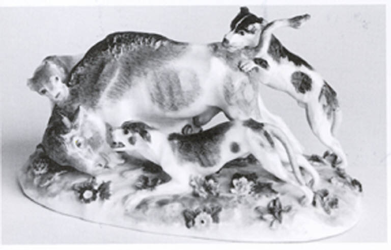 Gruppo su base ovoidale bianca con fiori policromi applicati, che rappresentano un toro selvatico (uro) assalito da tre cani da caccia. Nella tavolozza cromatica prevalgono il marrone e di diverse tonalità il grigio degli animali maculati, il verde-giallo, il blu, il rosa intenso dei fiori sparsi sulla base.