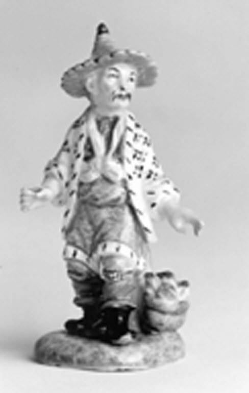 Figura maschile di cinese in miniatura su base quadrangolare verde screziato di marrone, dalla quale si alza un piccolo sostegno dello stesso colore. Il costume è costituito da pantaloni verdi infilati in stivaletti neri, veste color rosa intenso a piccole scaglie bianche, fiocco giallo al collo, giacca aperta bianca con fiorellini geometrici gialli e rosa intenso e con bordura bianca e nera che frastagliata, è verde con l'alta punta dorata.\nSulla base sulla sinistra dell'uomo, è posato un braciere che sprigiona fiamme gialle e rosse.\nSotto la base non verniciata è praticato un foro ovale