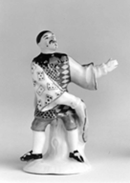 Statuetta raffigurante Arlecchino in miniatura su piccola base bianca con sostegno in forma di tronco. Il costume è costituito da brache turchesi al ginocchio, giubba con ampio collo nero che bottoni dorati dividono in due parti, una a losanghe gialle e rosso-ferro, l'altra a scaglie color rosa intenso. Anche le maniche sono bicolori: la sinistra gialla a scaglie rosa intenso, la destra bianca con carte da gioco policrome. Il piccolo mantello sul dorso è bianco e giallo; le scarpe sono nere con fiocchi gialli. La mano destra regge un ampio cappello lilla, mentre il capo è coperto da un'aderente papalina nera.