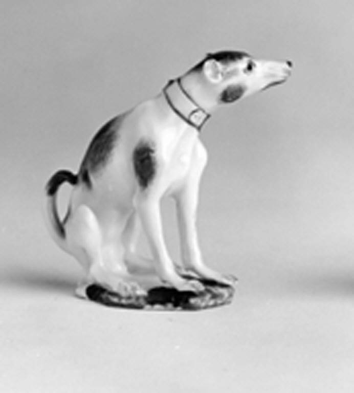 Statuetta in miniatura che rappresenta un cane levriero,con lunga coda rivolta all'insù, su base bianca con tocchi di verde. Il pelo è bianco con macchie marroni rese con fine tratteggio; intorno al collo è allacciato un collare giallo con fibbia e anello dorati.