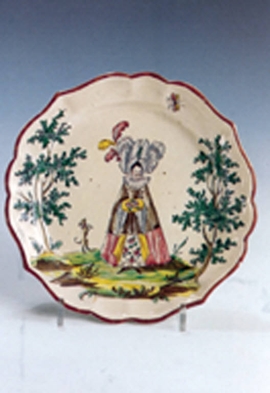 Piatto tondo con bordo mistilineo senza anello d'appoggio. Il piatto con orlo listato in rosso-bruno, reca al centro una decorazione con figura femminile.