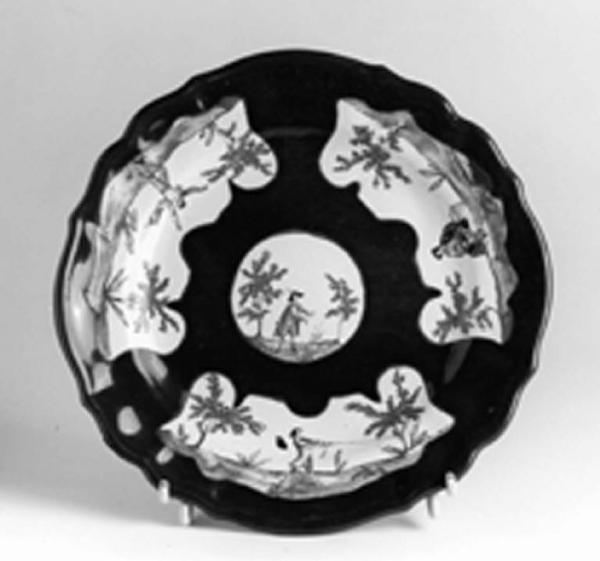Piccolo piatto piano dal profilo mistilineo senza anello d'appoggio " a paesini e figure a comparto blu" che mostra una riserva centrale tonda, più piccola, e tre riserve mistilinee.
