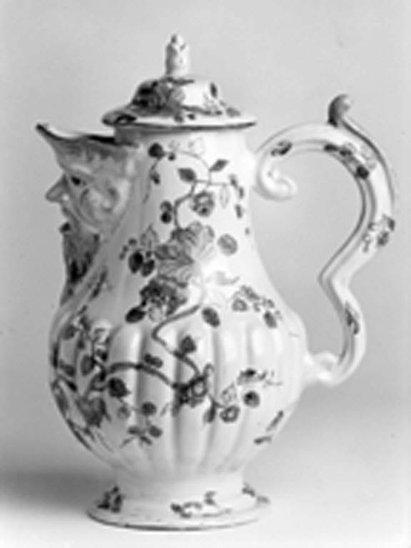 Caffettiera su basso piede rastremato e corpo baccellato. Importante versatoio a mascherone e ansa ad orecchio angolata. L'orlo è listato in oro.