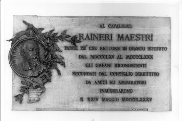 nel lato sinistro della lapide è presente in rilievo il busto in bronzo del benefattore Raineri Maestri