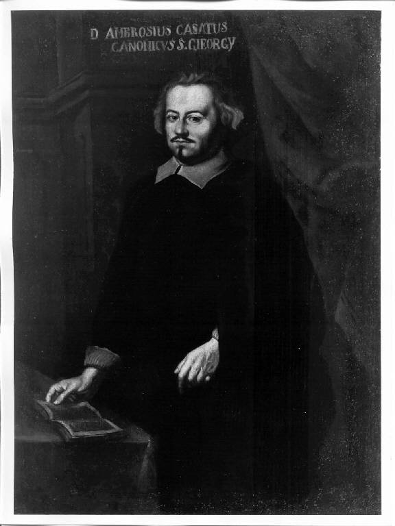 - NOTIZIE STORICO CRITICHE E' abbastanza improbabile che il ritratto sia di Ambrogio Casati perchè in seguito al restauro eseguito in occasione dell'esposizione del 1990 "Trivulzio, Martinitt e Stelline", la scritta appare posticcia mentre traspare, poco sotto, una scritta simile. Inoltre l'unico Ambrogio Casati Canonico di S. Giorgio (come recita l'iscrizione) muore attorno al 1620. La figura potrebbe altresì essere identificabile con un altro canonico di S. Giorgio al Palazzo, Giovanni Andrea, che nel 1670 nomina il luogo Pio della Stella erede universale. L'analisi sitlistica ed iconografica del dipinto fa pensare duque ad una datazione successiva, più precisamente riconducibile alla seconda metà del XVII secolo.