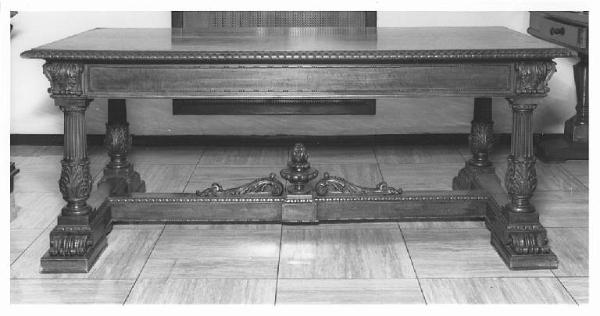 gambe unite da traverse laterali con colonne scanalate e foglie d'acanto nella parte inferiore, raccordate da traversa centrale con elemento decorativo a vaso fiammeggiante tra volute, piano profilato da bordura a ovoli