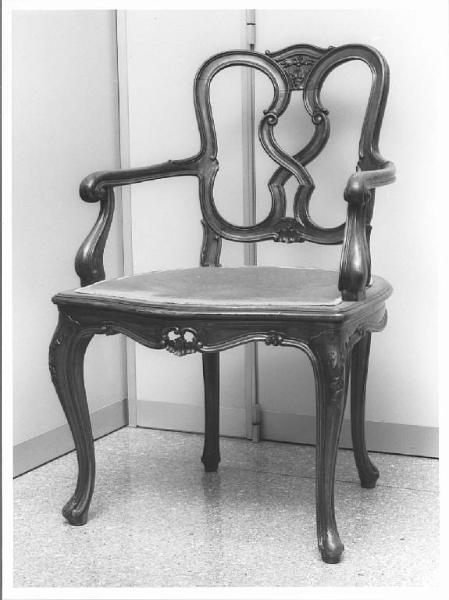 gambe incurvate verso l'esterno, sedile rigido, schienale traforato con motivo a nastro intrecciato, braccioli mossi