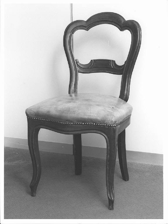 gambe a capriolo, sedile imbottito, schienale sagomato suddiviso in due parti da fascia modanata